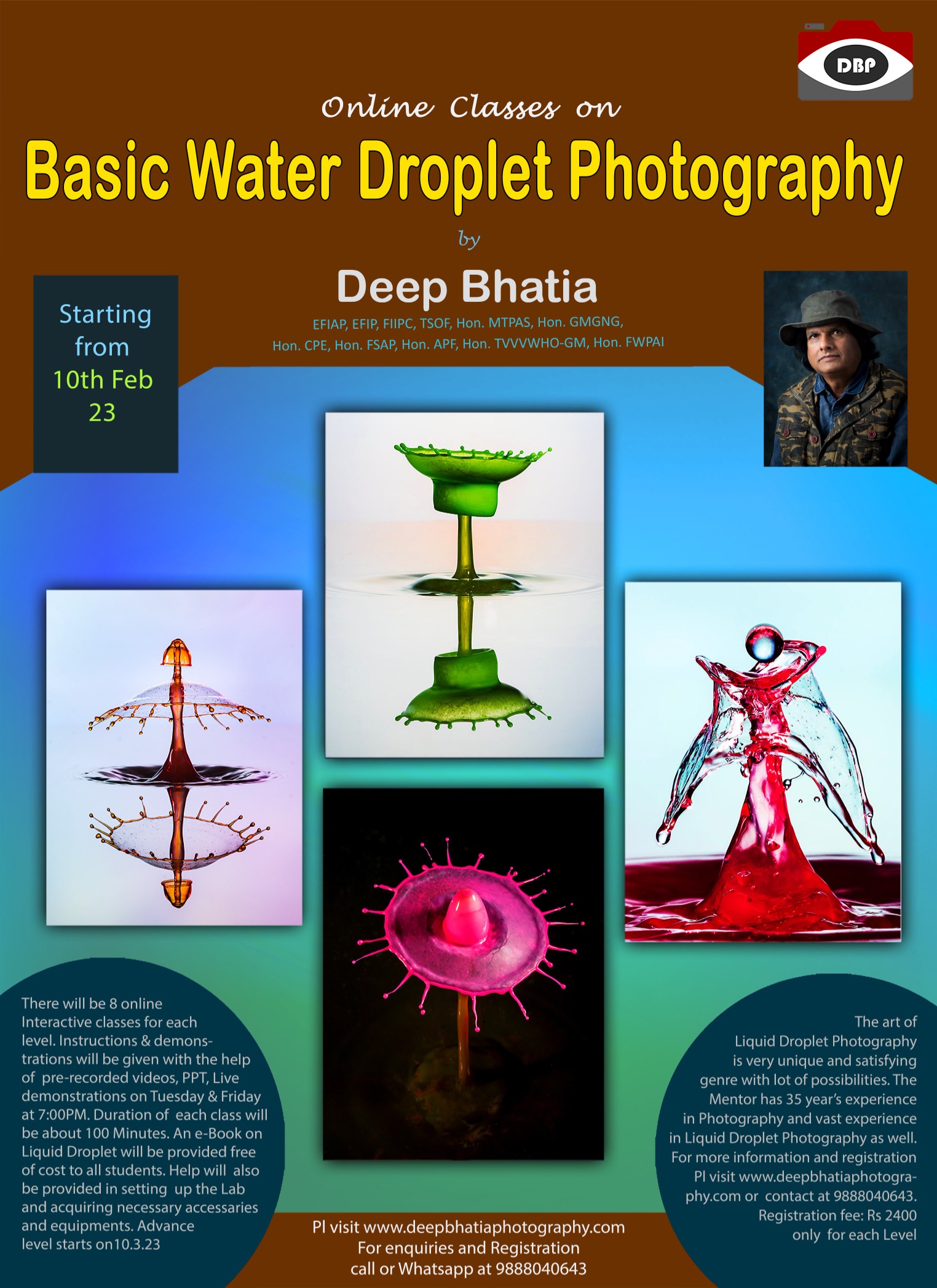 Deep Bhatia has embarked on a remarkable journey in the realm of Photography and has 38 year's experience. He has secured over 600 National and International Awards and received more than 6000 Acceptances in prestigious National and International Salons, Photo Competitions, in 24 countries around the world, in addition to numerous displays in India. He has come out with recorded courses and also hosts online classes covering various genres, including Water Droplet Photography, Still Life Photography, Post Processing, Creative, Surreal & Conceptual Photography, Studio Portraiture, and Glassware Photography at www.deepbhatiaphotography.in