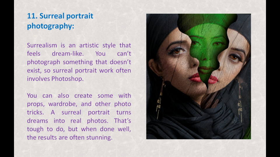 Explore a variety of portrait styles, including the intriguing realm of conceptual portraiture, in our course. Uncover techniques to convey unique ideas and narratives.