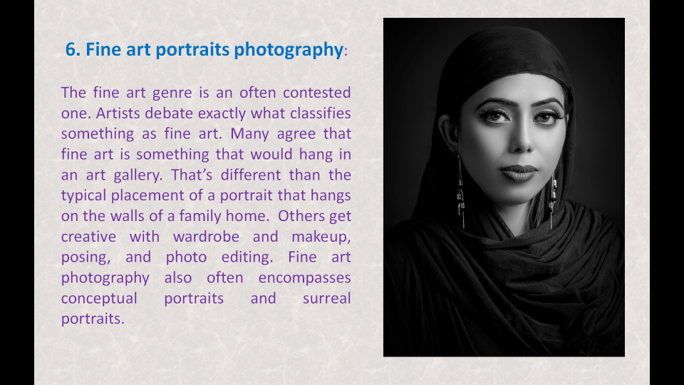 Discover a spectrum of portraiture styles, including the enchanting realm of fine art. Learn to evoke emotion and create visually stunning portraits that transcend the ordinary, enriching your photography skills.